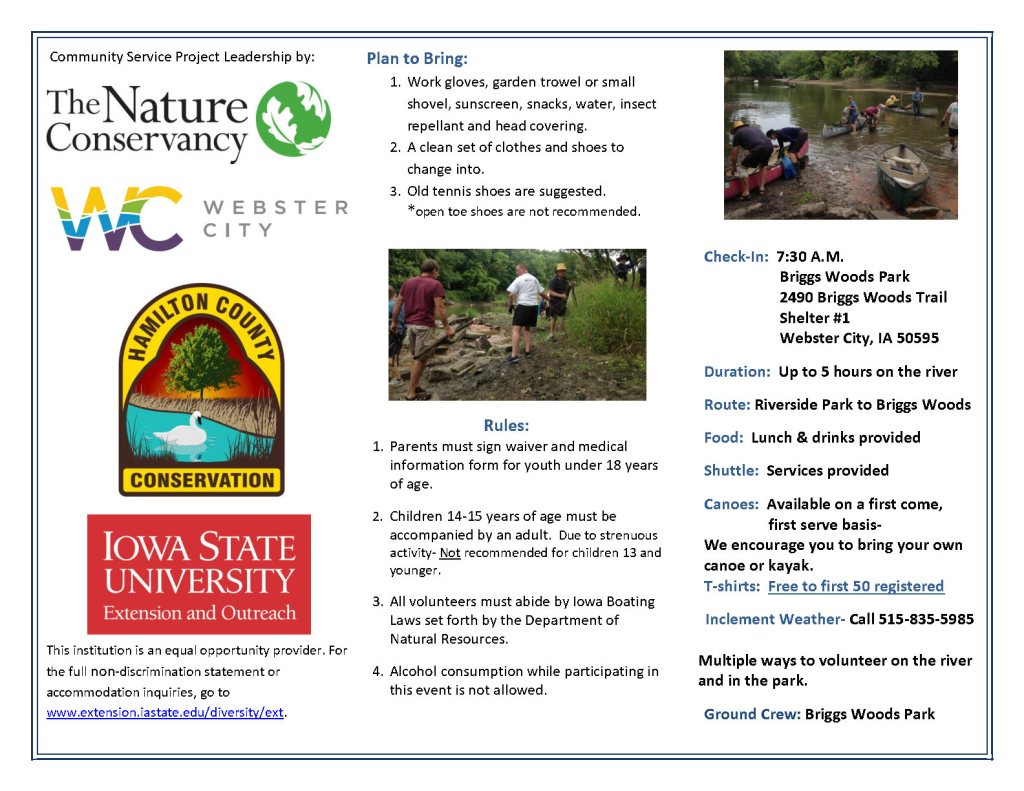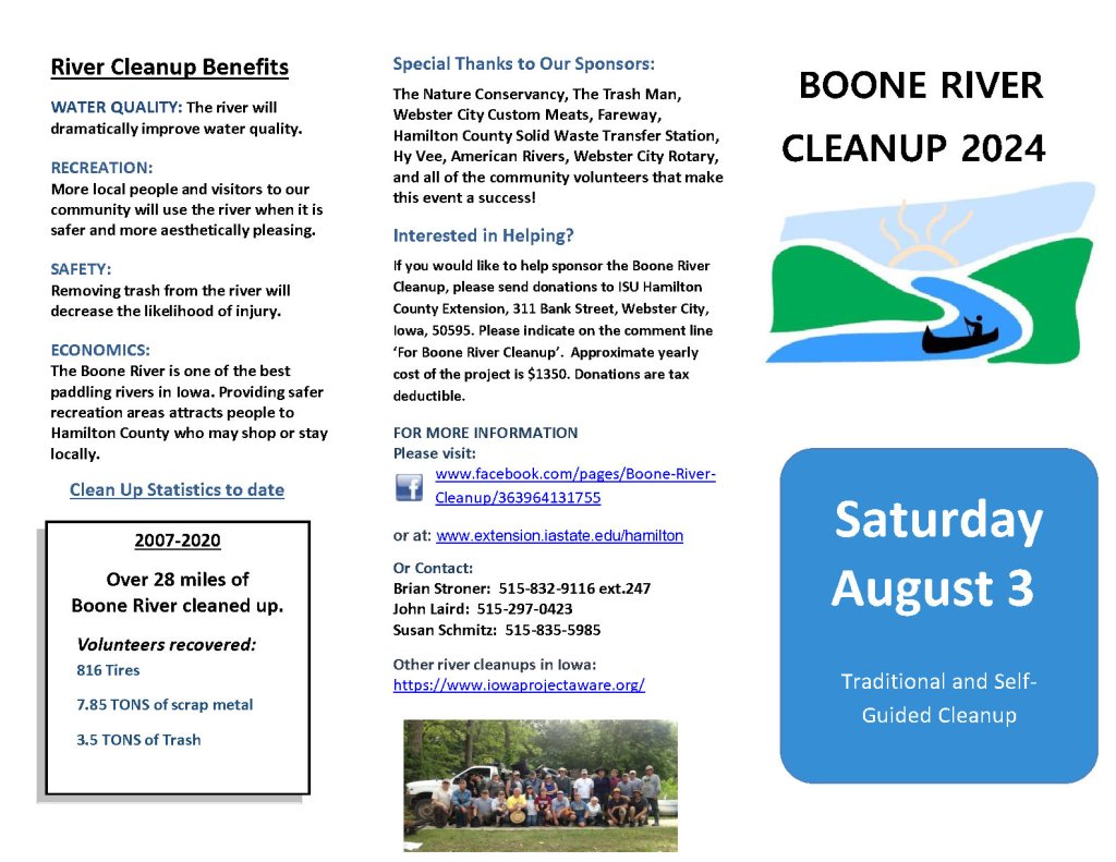 Events Boone River Cleanup 2024 Share this: Click to share on X (Opens in new window) X Click to share on Facebook (Opens in new window) Facebook Like Loading...